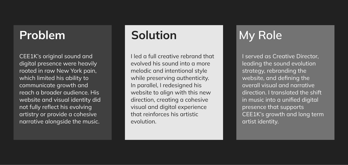 By aligning sound, visuals, and platform, the rebrand aimed to position CEE1K for long term artistic growth while making his evolution clear and accessible to both new and existing listeners.