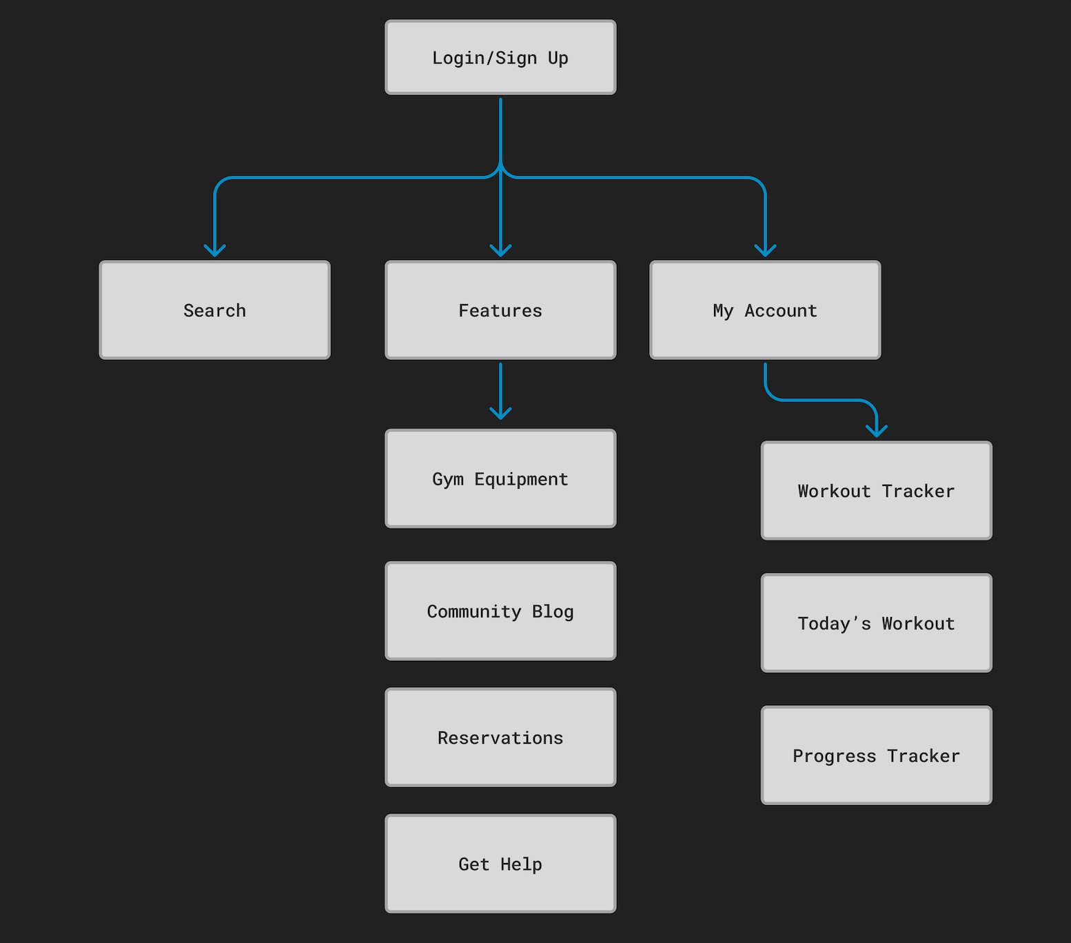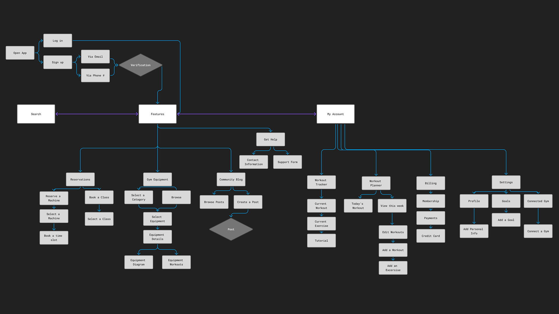 I translated the concept into a full site map and detailed user flows that outlined how users would plan a workout, reserve equipment, check gym updates, or interact with the community. Working closely with the team, I refined the information architecture and aligned us on the product framework that guided the wireframes and final prototypes.