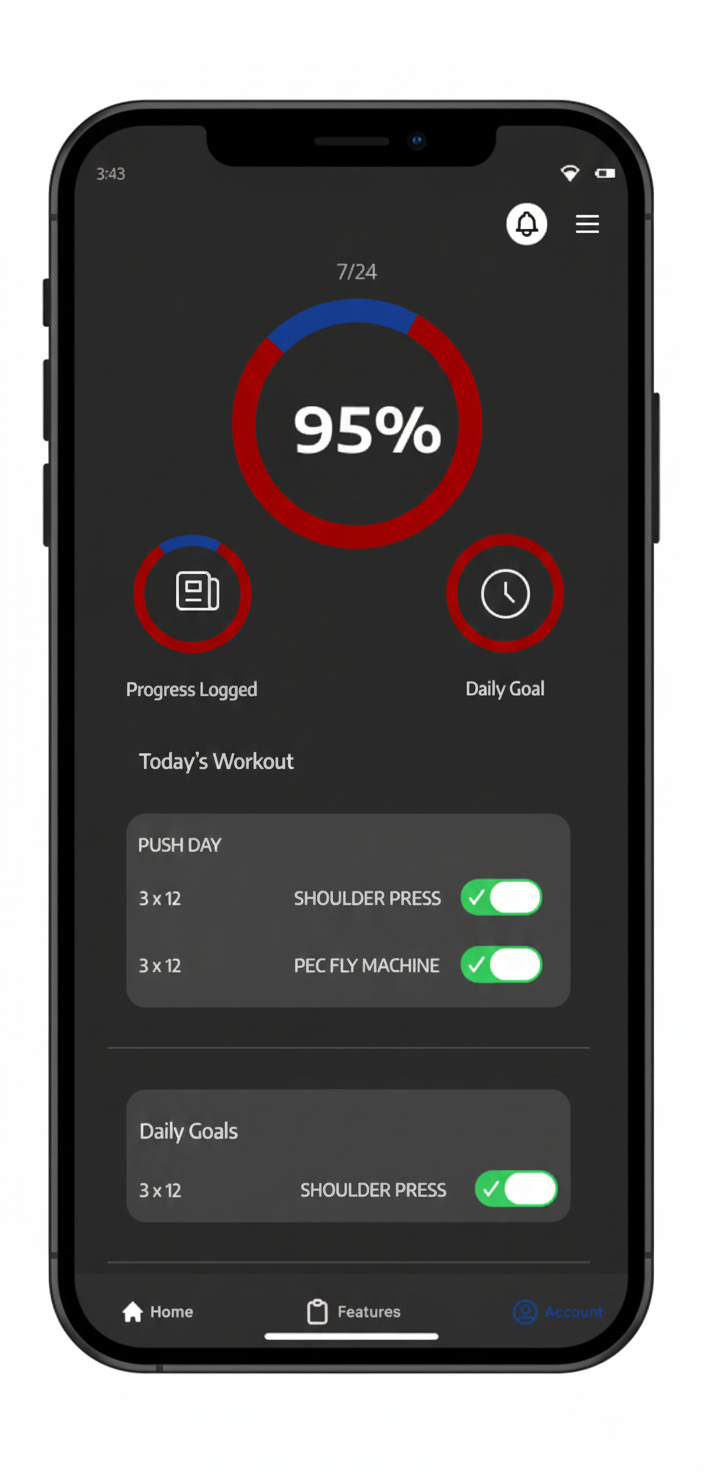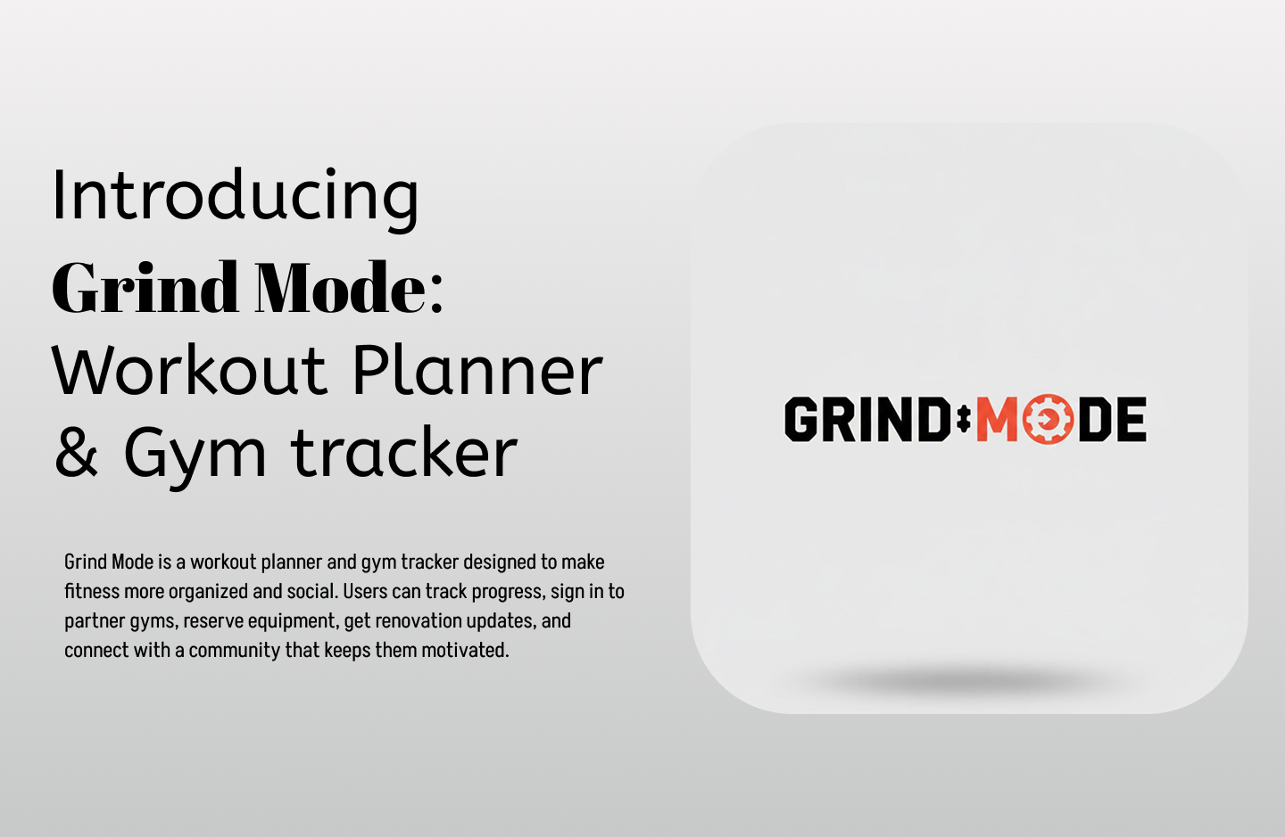 For Grind Mode, I designed a system that brings clarity, structure, and connection to the fitness experience. The concept focuses on giving users one place to plan workouts, track progress, sign in to partner gyms, reserve equipment, check renovation updates, and connect with their fitness community.
